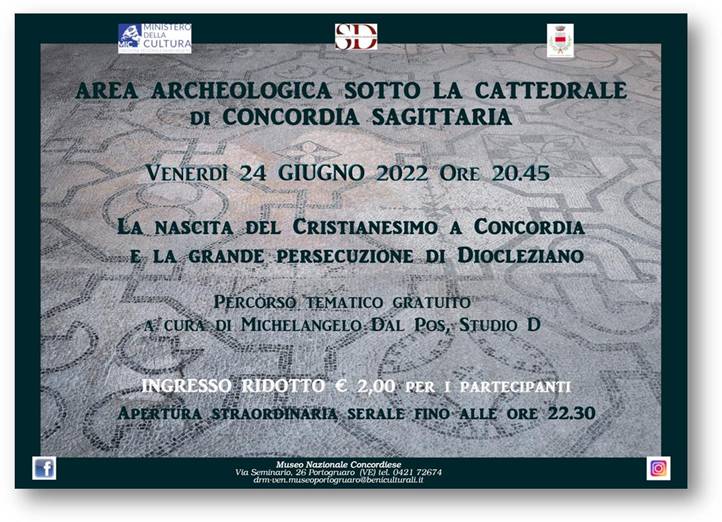 APERTURA STRAORDINARIA | 24 Giugno 2022 ore 19.30-22.30 | Area archeologica sotto la Cattedrale di Concordia Sagittaria | Ore 20.45 La nascita del Cristianesimo a Concordia e la grande persecuzione di Diocleziano